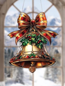 Acrylic Christmas Bell Window Hanging: Gold Bell, Red Bow (2D Ornament)