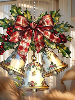 Christmas Bells Faux Stained Glass Acrylic Suncatcher With Red Bow And Holly Leaves Window Hanging Holiday Decor Gift For Family