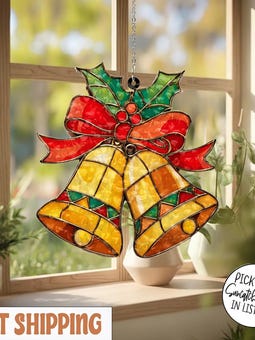 Christmas Jingle Bells Acrylic Suncatcher, Faux Stained Glass And Bow Window Decor, Classic Holiday Gift For Mom, Christmas Decor, Xmas Gift