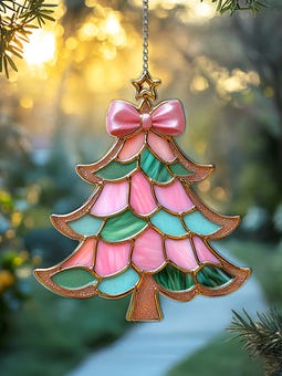 Glitter Bow Pastel Christmas Tree Acrylic Window Suncatcher | Pink & Teal Layers, Shimmer Tree Light Catcher, Cute Holiday Ornament Gift