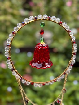 Handmade Christmas Bell Suncatcher – Red Crystal, Boho Christmas Decor, Rainbow Maker