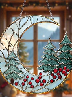 Moon and Pine Trees Acrylic Suncatcher Ornament, Christmas Tree Window Hanging, Holiday Decor Gift, Winter Holiday Decor, Christmas Gift