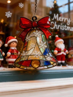 Stained Glass Christmas Bell Ornament, Vintage Style with Red Bow